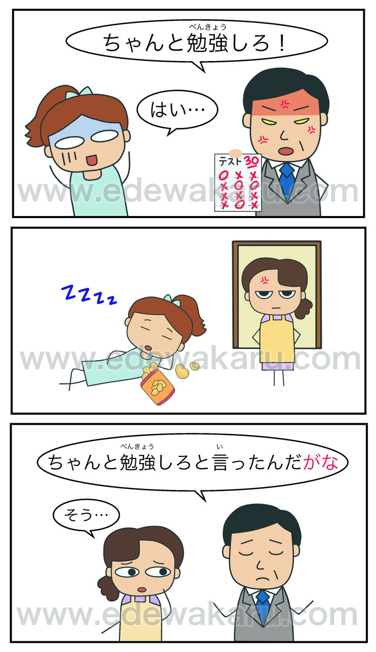 父:ちゃんと勉強しろと言ったんだが…(していない…ちゃんと勉強すると思ったのに…)