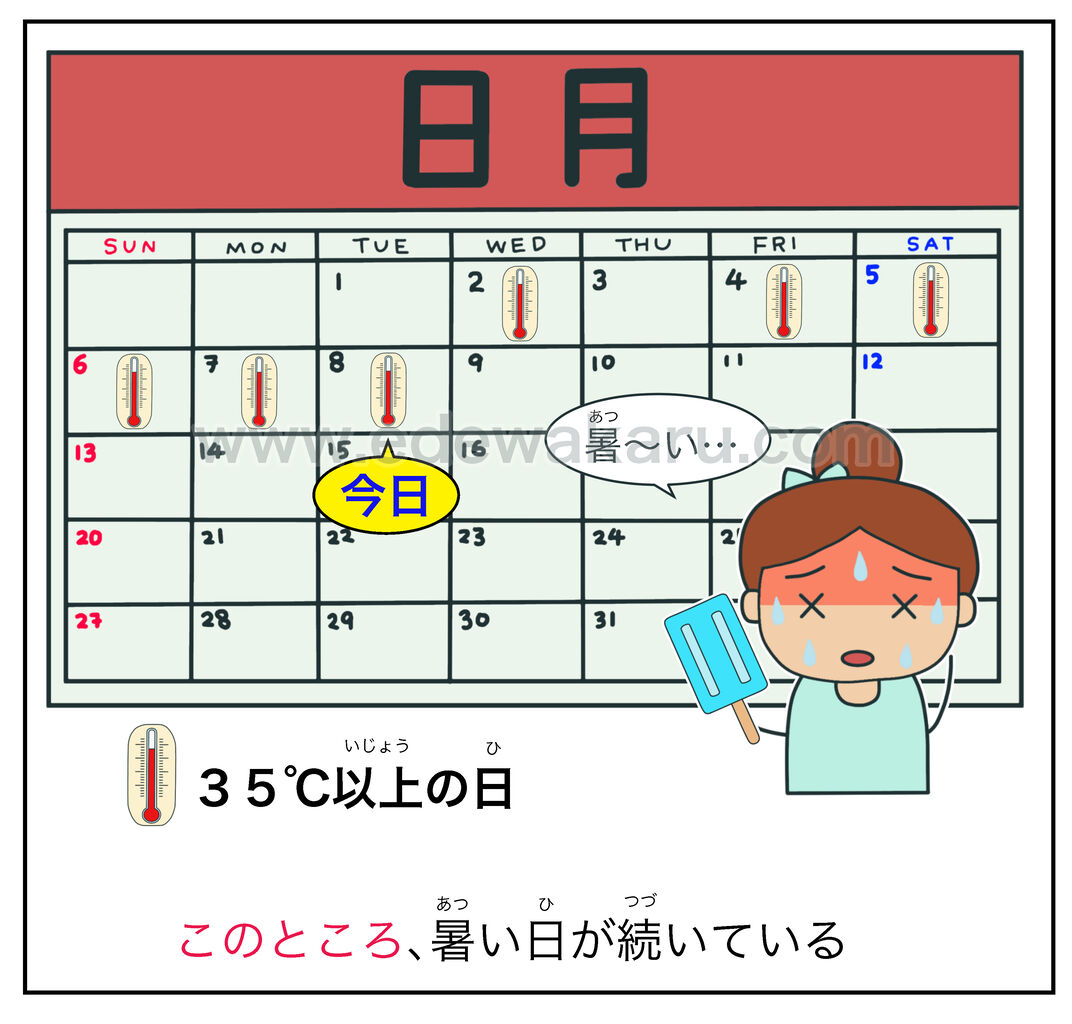 ①このところ、暑(あつ)い日(ひ)が続(つづ)いている