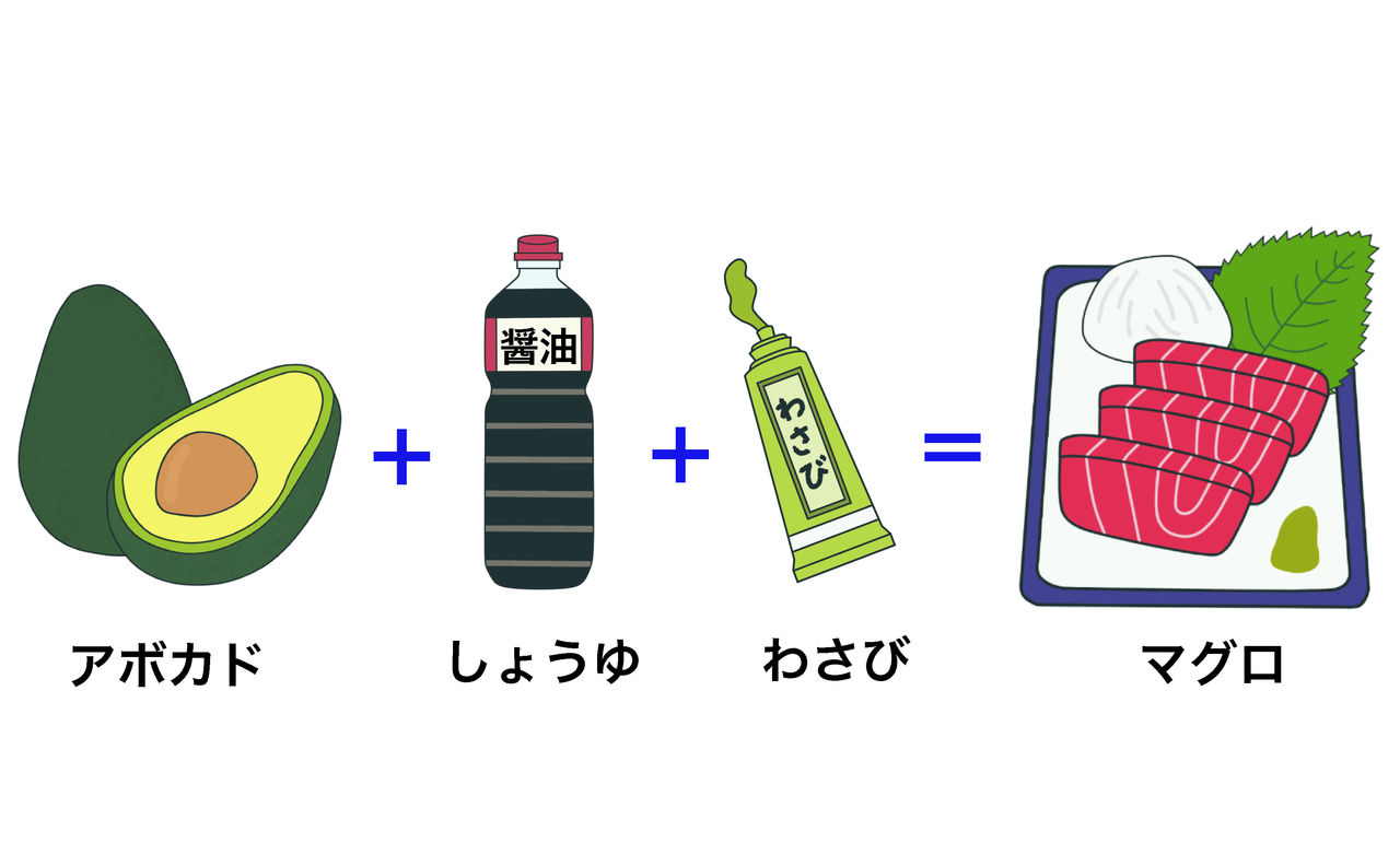 「〇〇+〇〇=〇〇」という例(れい)はたくさんありますが、何と言っても有名(ゆうめい)なのは「アボカド」+「しょうゆ」+「わさび」=「マグロ」なのではないでしょうか?