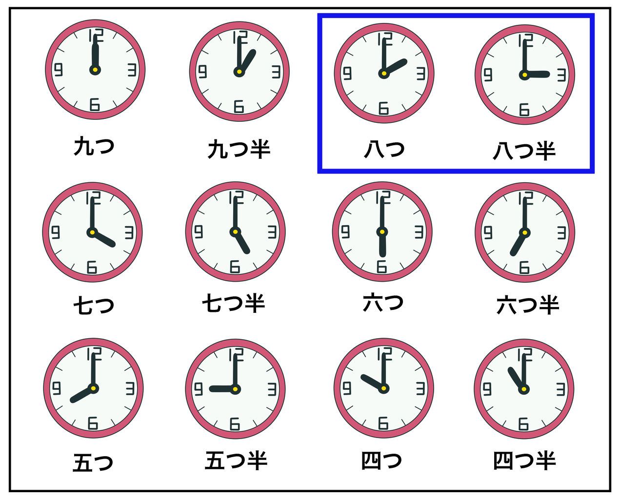 また、昔は今(いま)と時間の数え方(かぞえかた)が違いました。上(うえ)の絵(え)のように2:00〜3:00のことは「八つ時(やつどき)」と呼(よ)びました。【「八つ時」に食べる間食】ということから「八つ」に「お」をつけて「おやつ」と呼ぶようになったと言われています😀