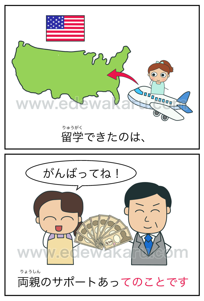 ①留学(りゅうがく)できたのは、両親(りょうしん)のサポートあってのことです