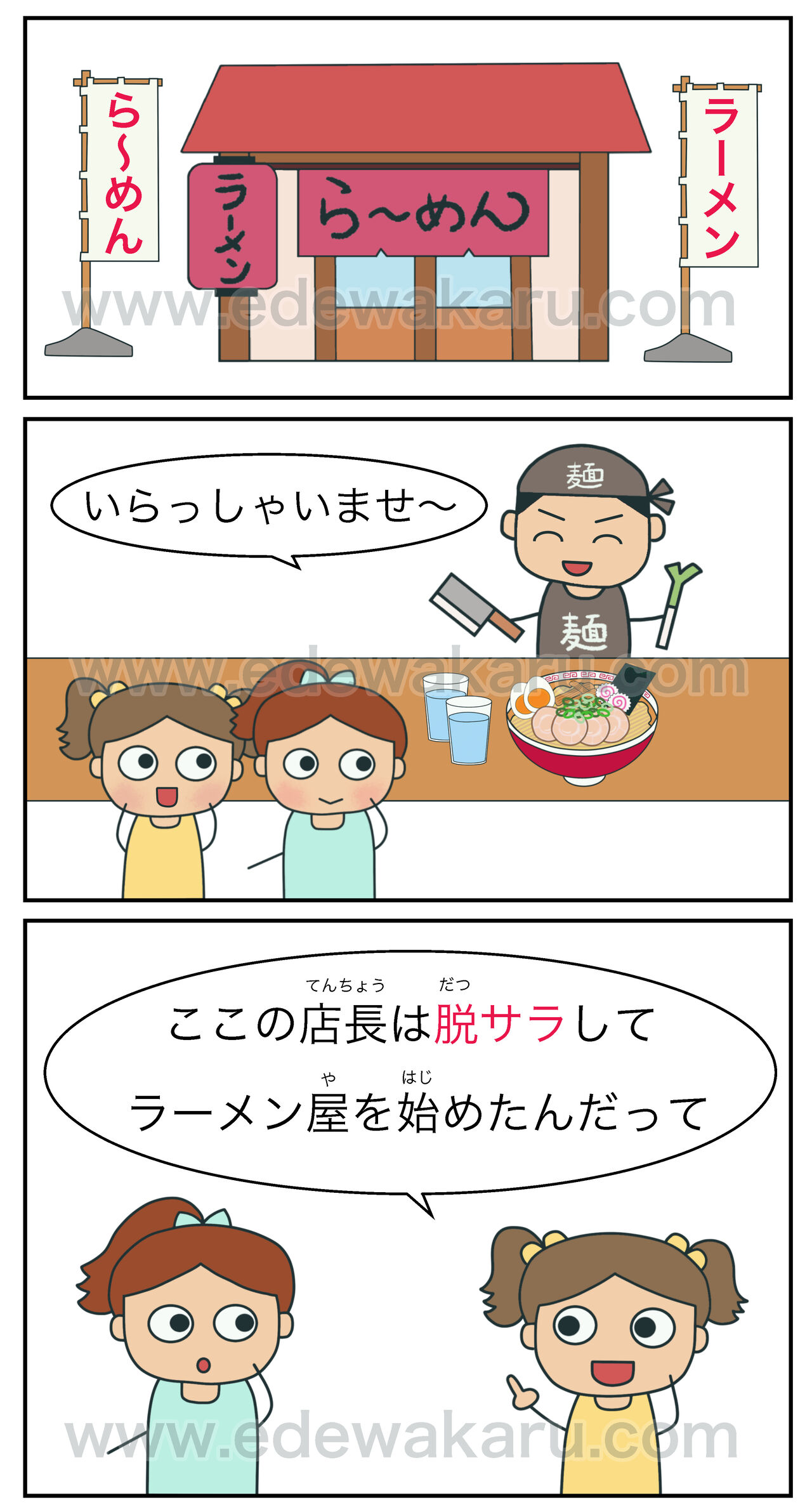 ①ここの店長(てんちょう)は、脱(だつ)サラしてラーメン屋(や)を始(はじ)めたんだって