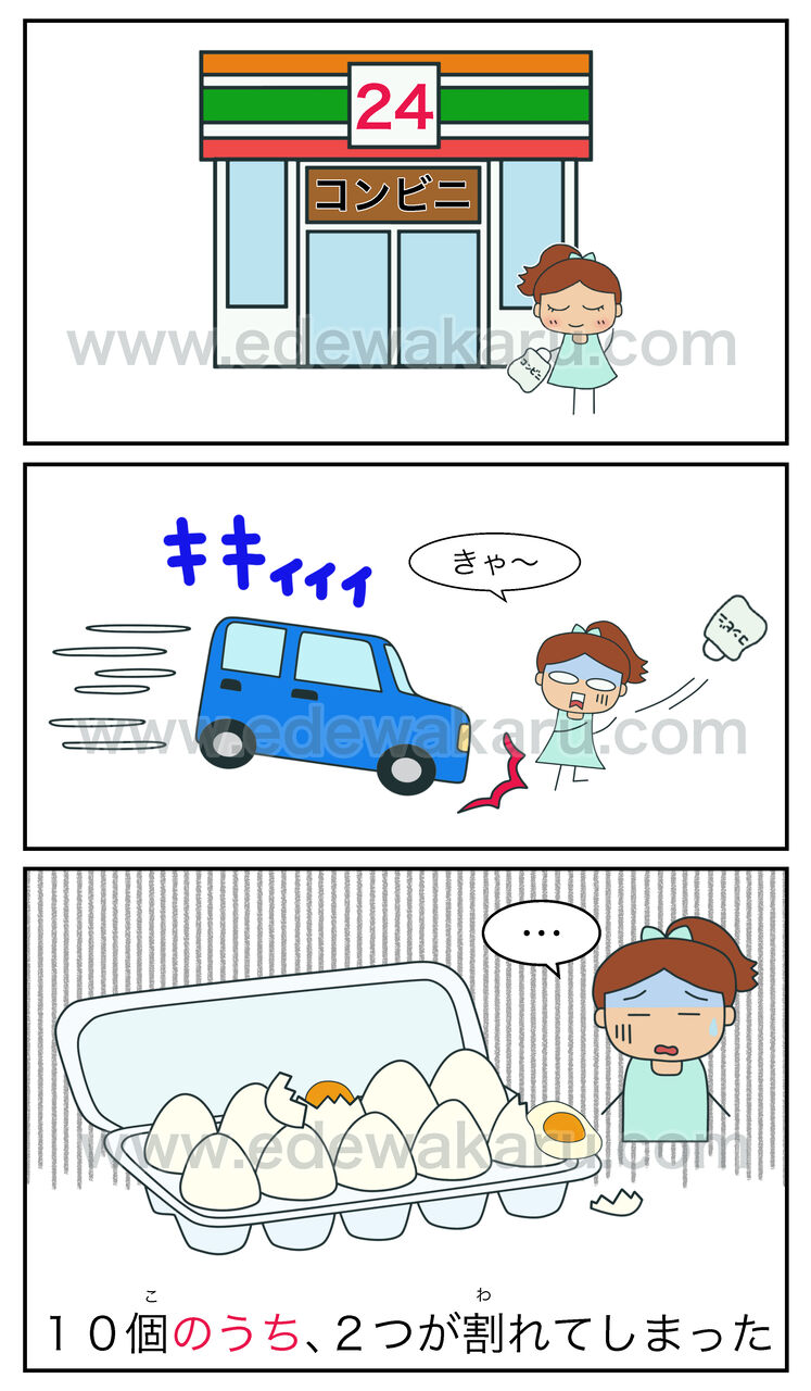 ①10個(こ)のうち、2つが割(わ)れてしまった