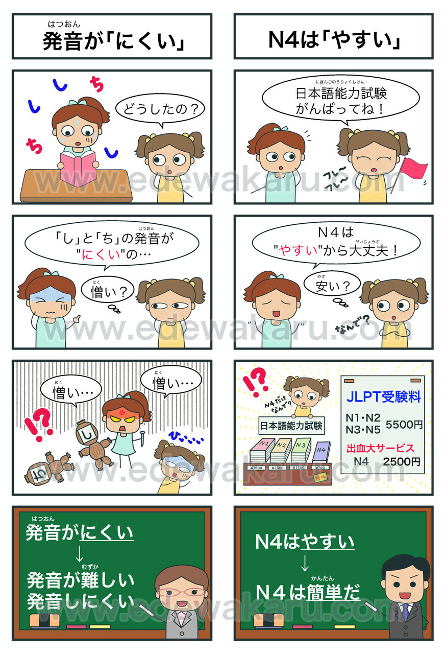 上(うえ)の絵(え)のような使(つか)い方(かた)をしてしまうと、日本人には「〜やすい」「〜にくい」が別(べつ)の意味(いみ)に聞(き)こえてしまう場合(ばあい)もあります😨