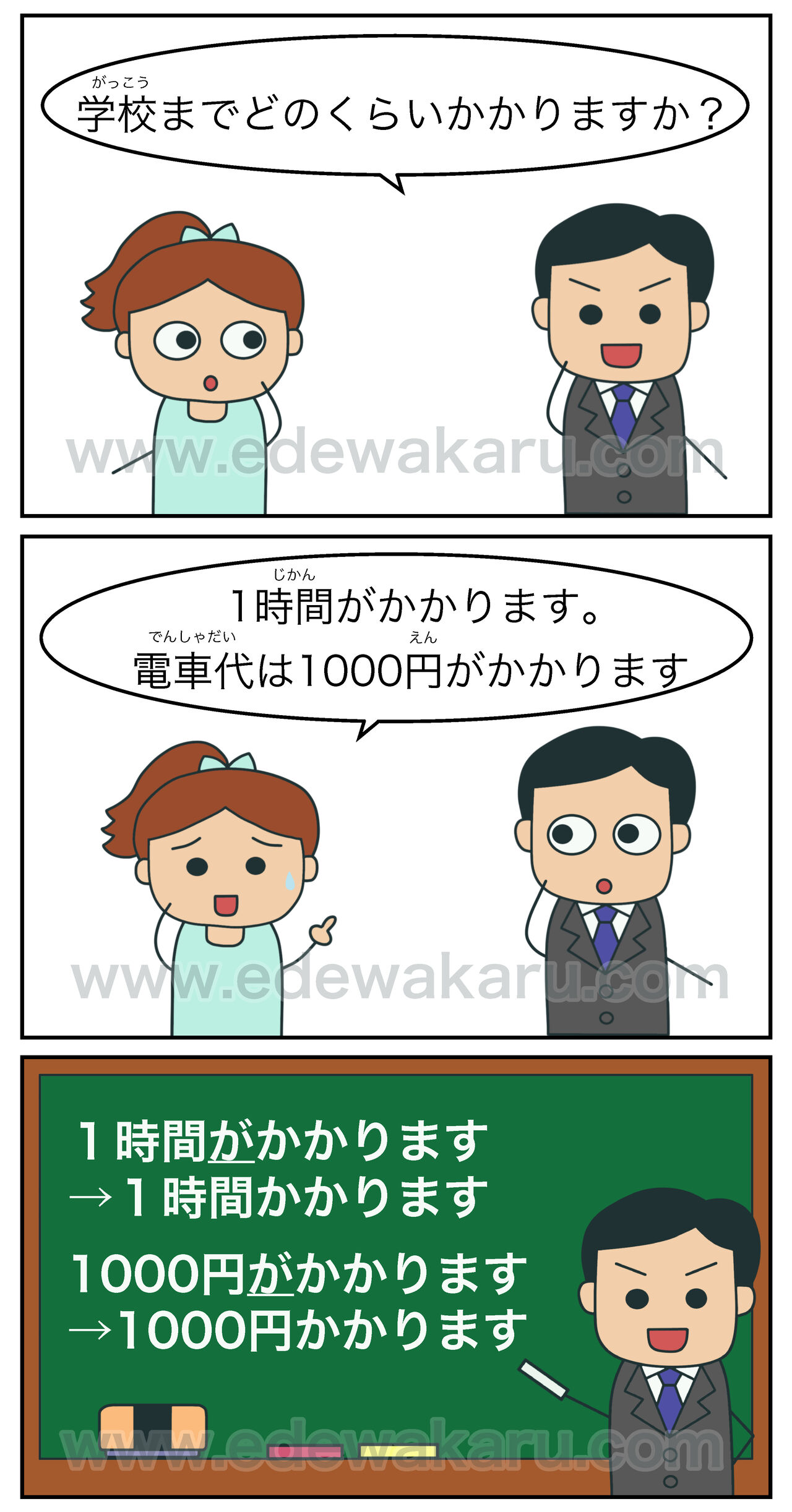 「〜かかる」の前に「〇〇時間」「〇〇円」などがくる場合は、助詞(じょし)の「が」は使いません。「〇〇時間かかる」「〇〇円かかる」の形(かたち)で使用(しよう)されます。【時間】には「〜秒(びょう)・〜分(ふん)・〜時間・〜日(にち)・〜週間(しゅうかん)・〜か月(げつ)・〜年(ねん)」などを使(つか)います。また【金額(きんがく)】には「円・ドル・ユーロ」などが使われます😊