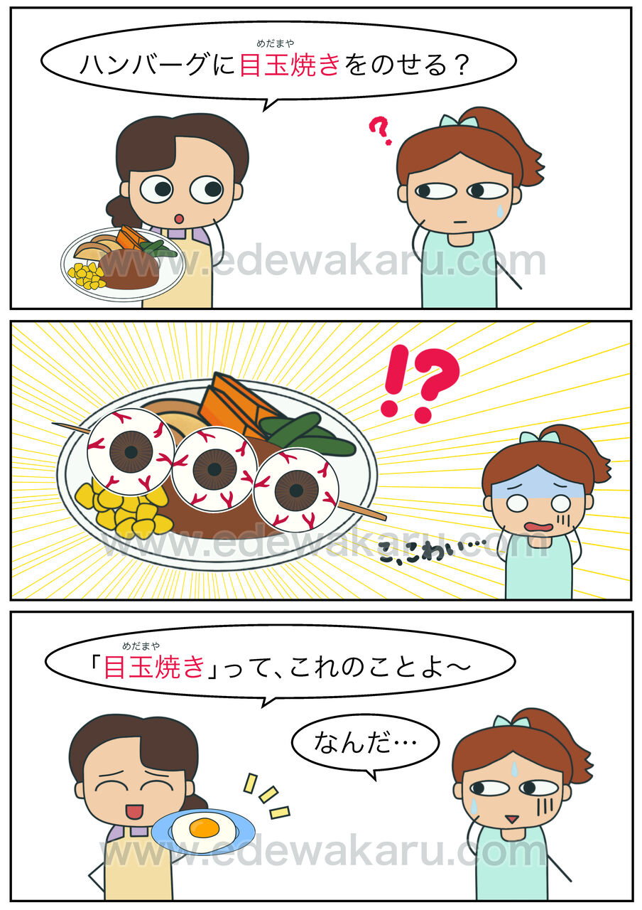 「目玉焼き(めだまやき)」とは、フライパンに卵(たまご)を割(わ)って入(い)れ、焼(や)いた料理(りょうり)のことです。割った卵はかき混(ま)ぜたりせずに、そのままの状態(じょうたい)で焼きます。黄身(きみ)と白身(しろみ)の状態が、まるで「目玉(めだま)」のように見えることから、「目玉焼き」と呼(よ)ばれるようになったそうです。