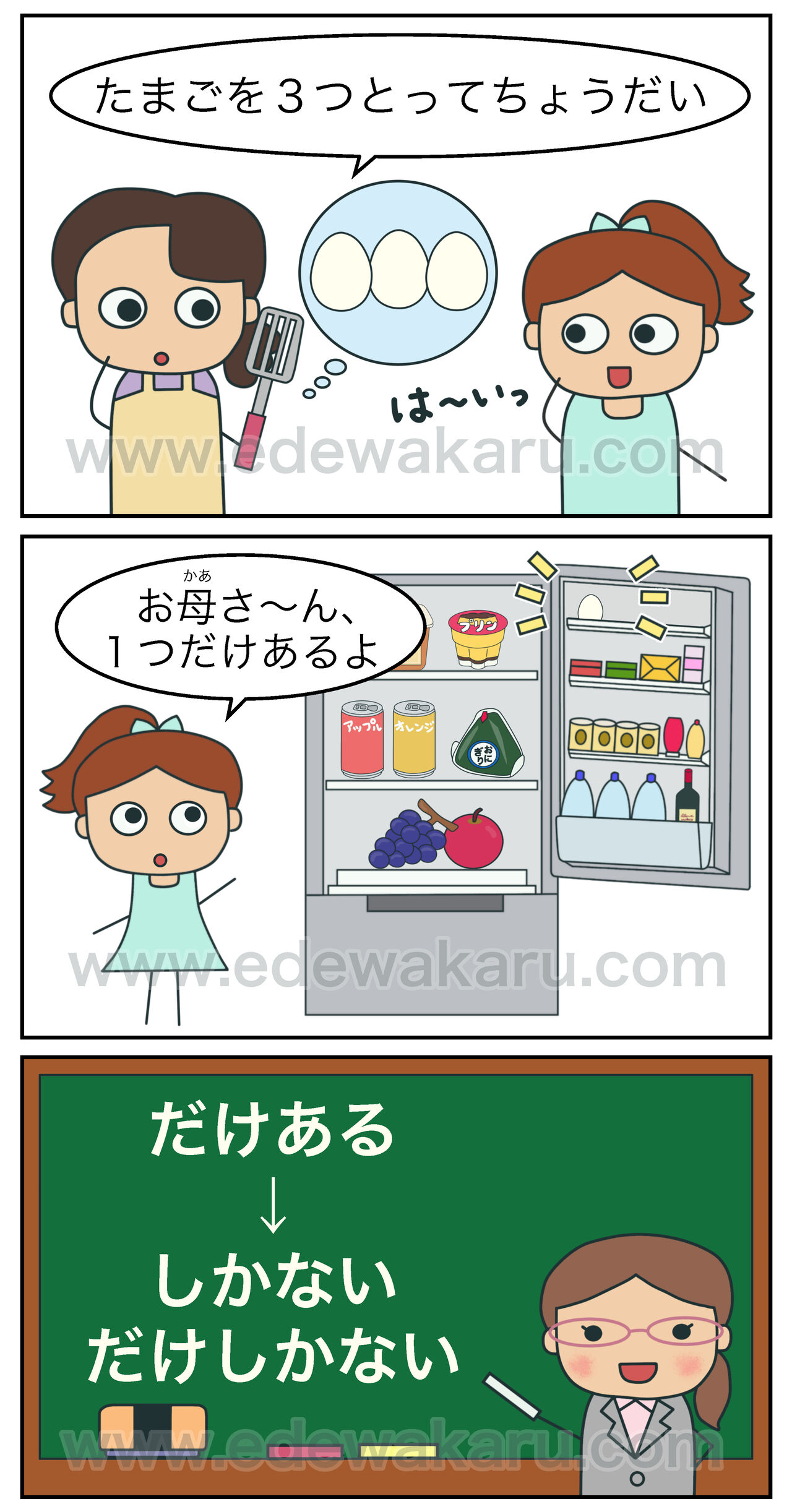 母:「たまごを3つとってちょうだい」