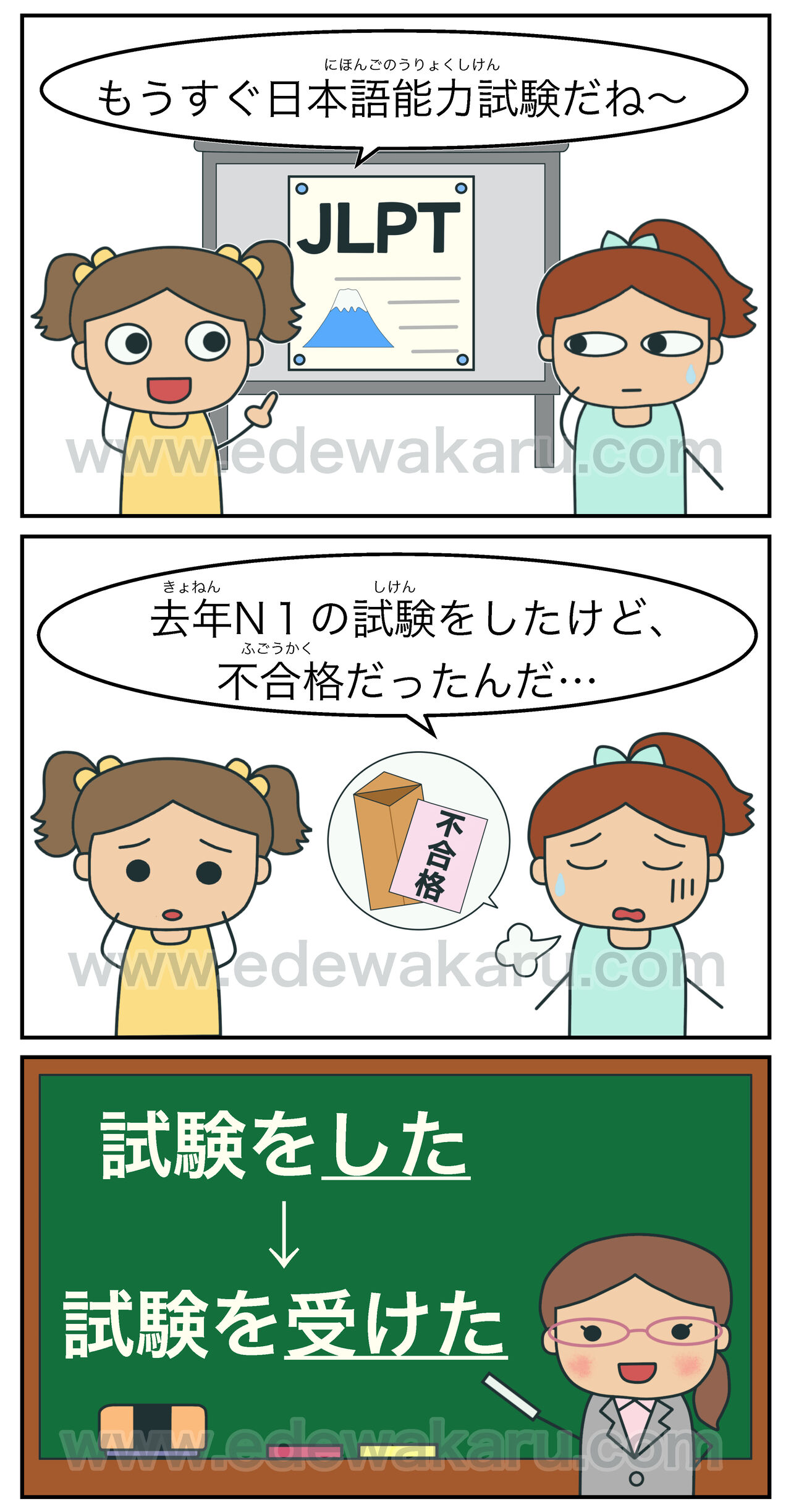 ❌去年(きょねん)、N1の試験(しけん)をしたけど不合格(ふごうかく)だったんだ…