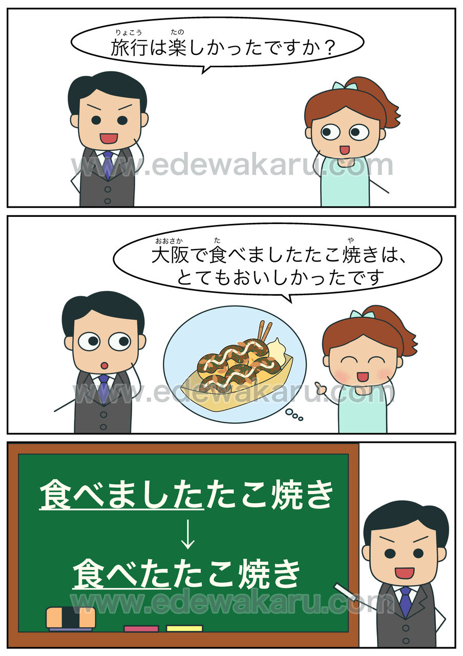 動詞(どうし)を使(つか)って名詞(めいし)を修飾(しゅうしょく)する場合(ばあい)は、「V[普通形(ふつうけい)]+名詞」になります。「Vます」「Vました」など、丁寧形(ていねいけい)は使われませんので注意(ちゅうい)しましょう。名詞修飾についての間違(まちが)いを復習(ふくしゅう)しておきましょう。