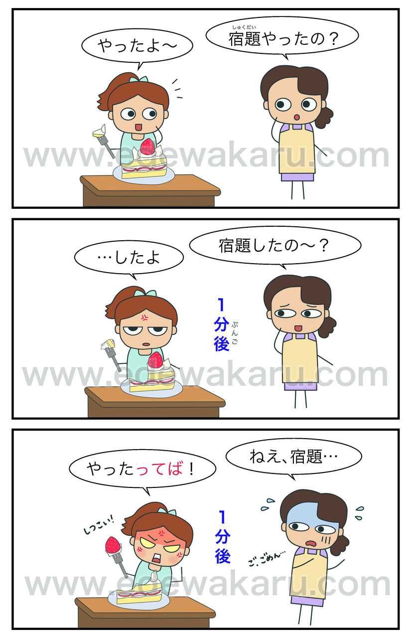 「〜ってば」はイライラしている気持ちが入ってしまう文型だというのを覚えておいてください😊会話でとてもよく使いますので、テレビやドラマで聞く機会も多いと思います😄