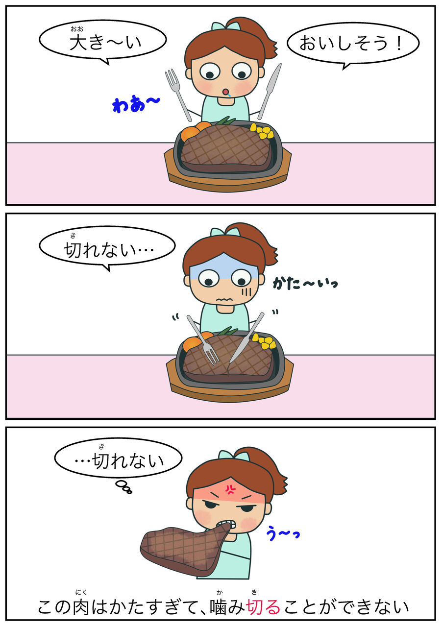 ①この肉(にく)はかたすぎて、噛(か)み切(き)ることができない…