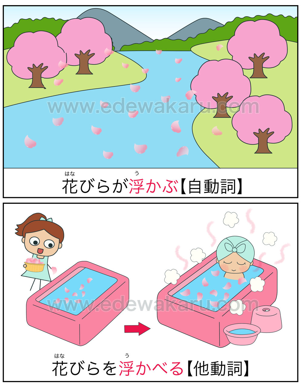 ②花びらを[浮かべて・浮かんで]お風呂に入る