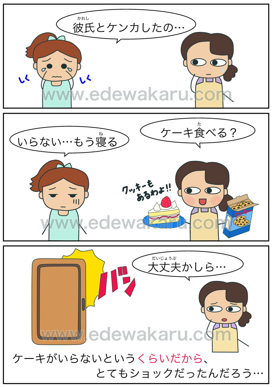 →ケーキが大好(だいす)きなのにいらないと言っている状況(じょうきょう)を見て、「すごくショックだったんだろう」と推測(すいそく)している