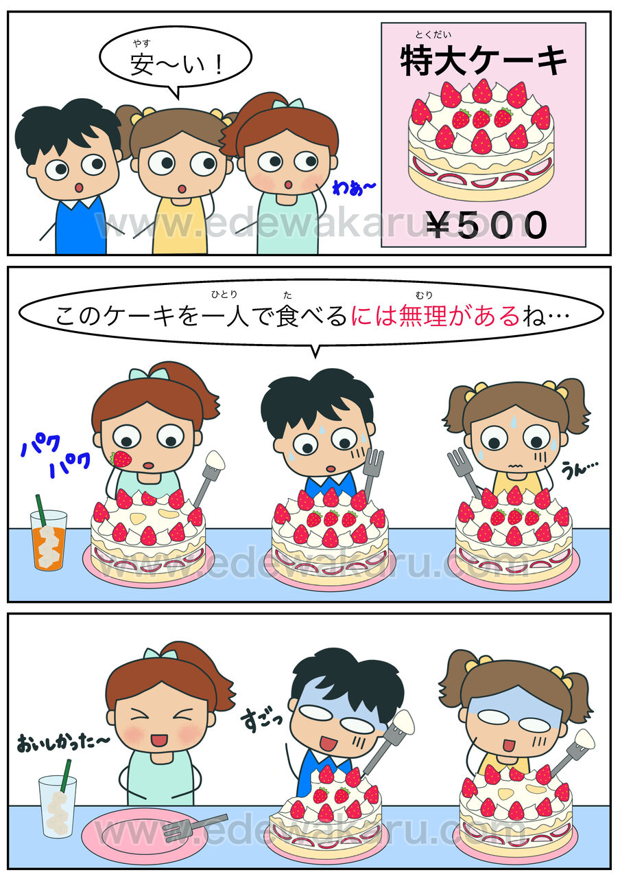 ①このケーキを一人(ひとり)で全部食べるには無理(むり)があるよ